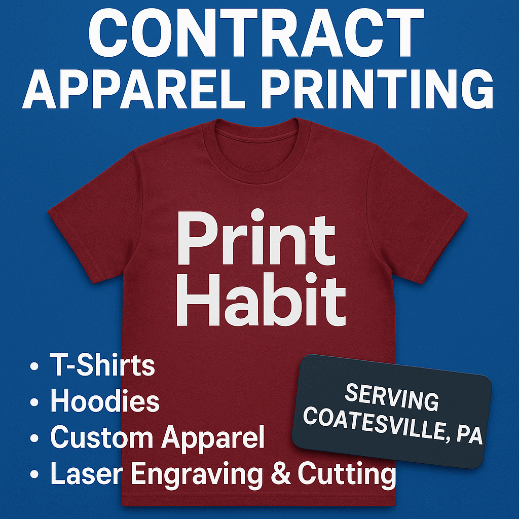 Print Habit provides contract apparel printing for brands, resellers, and distributors who need high-quality production without the overhead of managing presses. Based in Coatesville, PA and serving Downingtown, Exton, and surrounding areas, Print Habit delivers consistent results in t-shirts, hoodies, custom apparel, and more—all at competitive wholesale pricing.