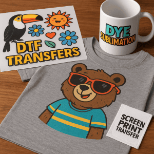We offer high-quality DTF (Direct to Film) transfers, screen print transfers, and dye sublimation transfer sheets, sticker sheets. Each method is optimized for different materials, effects, and production volumes.