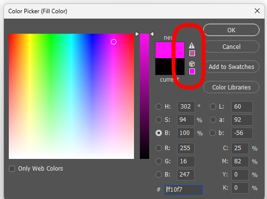 Open your color picker. See the warning triangle? That is telling you that color will not be printed in CMYK with the current profile. The little box below the warning tells you the closest match that can be printed. Click on it and it will automatically adjust to the closes in gamut color.